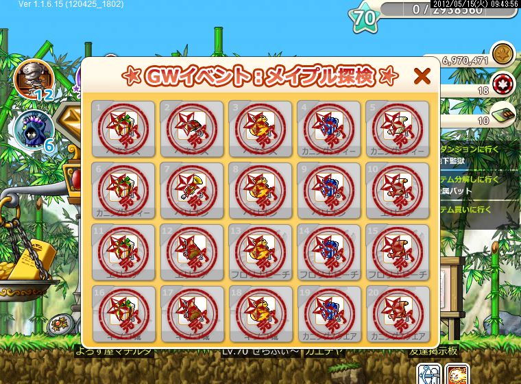 というわけで前に平行してやっているゲームの話をしましたが、今日同じヤフモバの「メイプルストーリー騎士団」のGWイベントがようやく終わりました。17日までのイベントだったのでギリギリでしたねー。イベントの内容はスタンプラリー的なもので、一定条件をクリアしていくとアイテムがもらえるというものでしたが、プレイしている人はご存知でしょうがこの条件がなかなか鬼畜で大変でした。