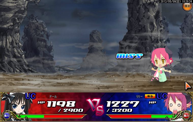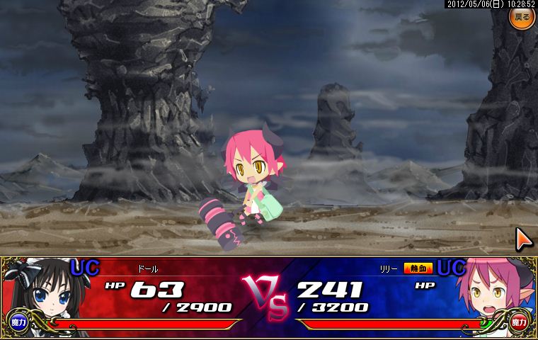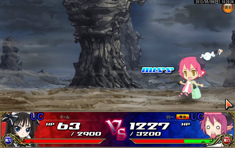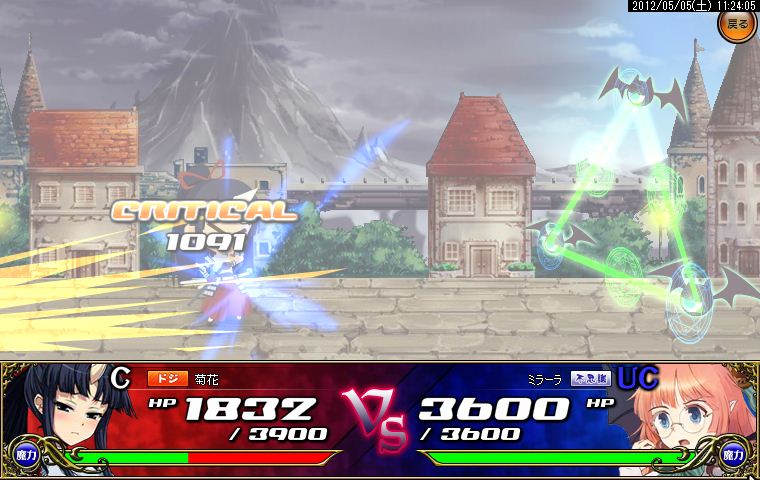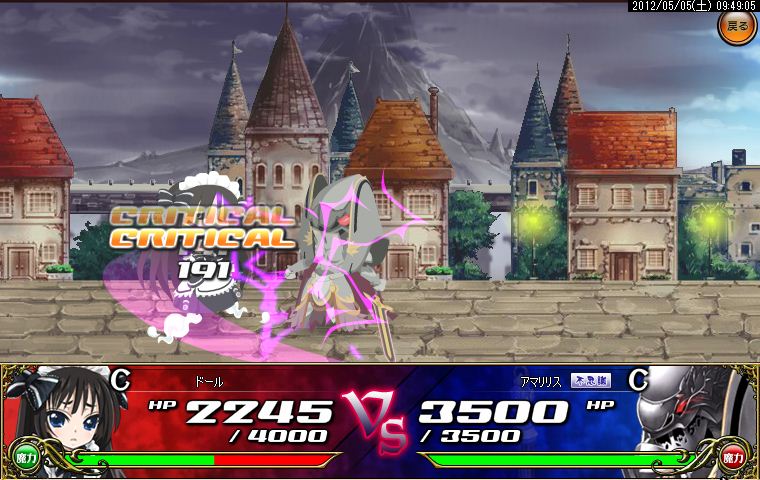 開幕からござるに居合い斬りを決められ、次の攻撃を何とかガードしたものの窮地に追い詰められてしまったアルちゃん。しかしここで颯爽と援護が到着!アルちゃん主導の下、息のあった攻撃がなんと形勢大逆転のクリティカルヒット!危なかったもののさすがの勝利。アルちゃんのクリティカル率は異常です。